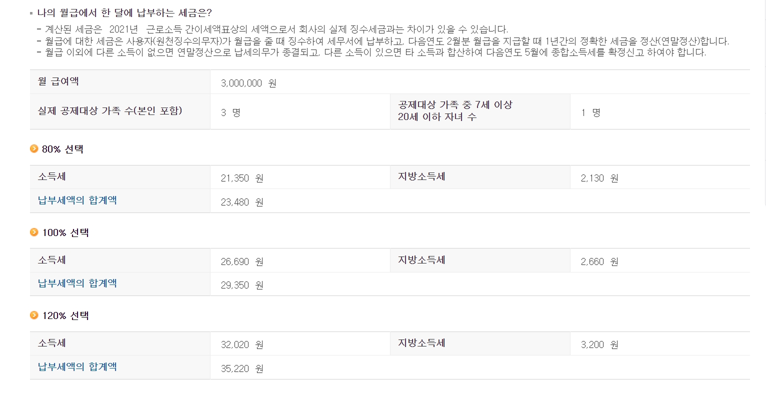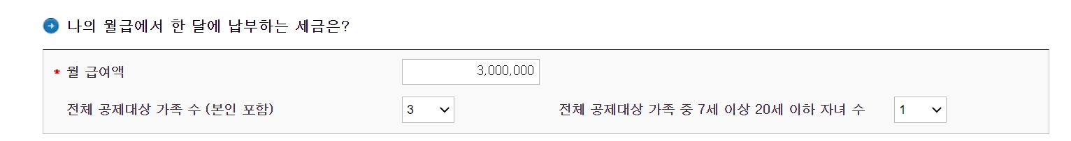 임의로 계산해보겠습니다. 내 월 급여가 300만 원이고 나를 포함한 가족 수가 3명일 때, 그리고 그 가족 중 20세 이하 자녀가 1명일 경우로 계산해 보도록 하겠습니다.