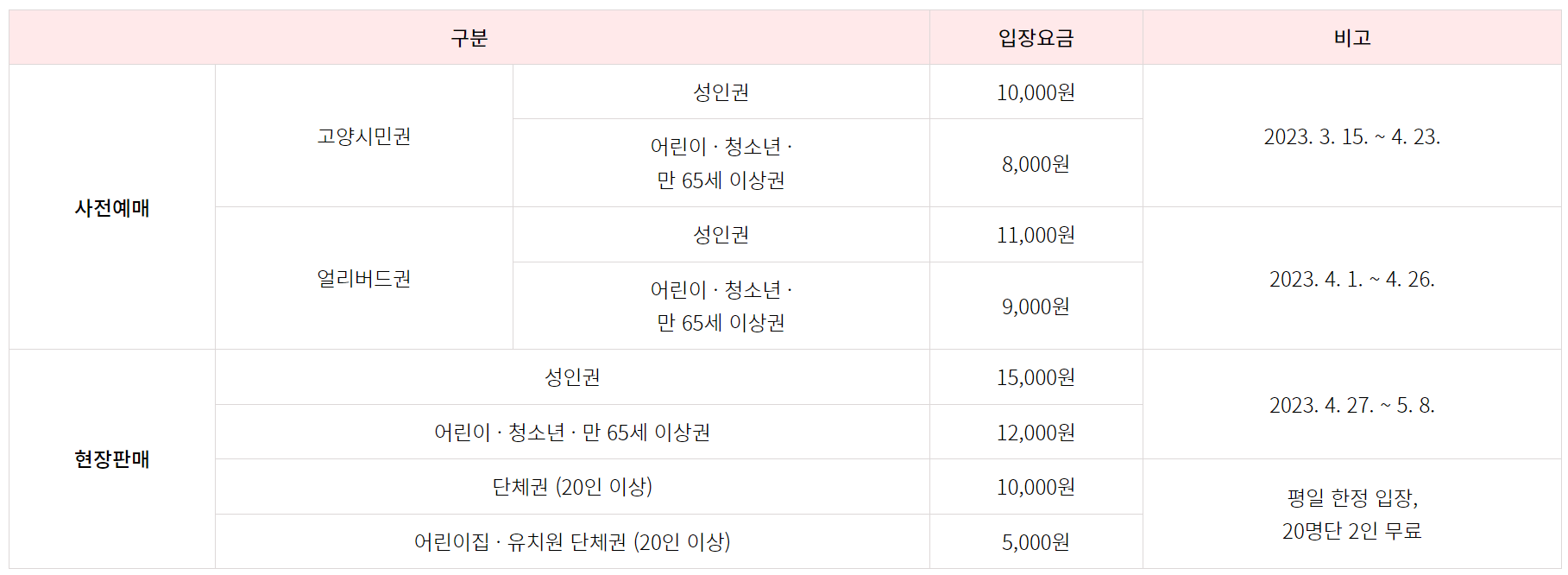고양에 살고있는 시민의 경우 1만 원이지만 타 지역에서 해당 박람회를 입장하기 위해서는 15,000원을 내야합니다. 어린이의 경우 만 3세부터 입장료를 받고 있으며 36개월 미만의 경우 증빙서류 지참 시 무료입장이 가능합니다.