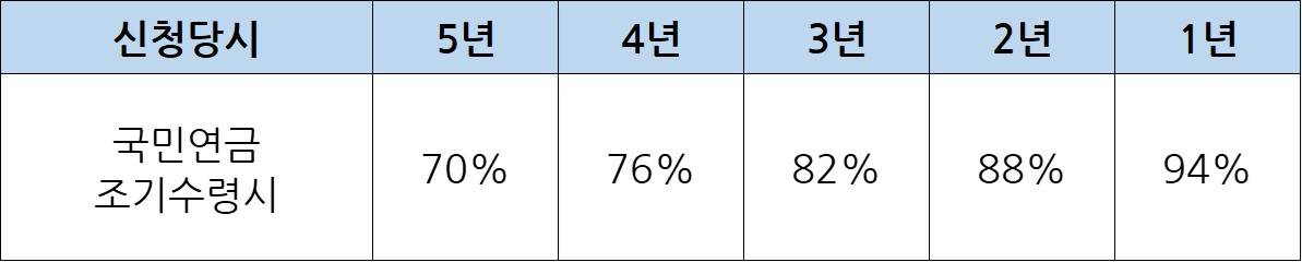 조기수령시 1년을 앞당길 때마다 6% 가량이 감액되는데요, 최대 5년까지만 앞당겨 수령할 수 있고 이럴 경우에는 최대 30% 가량이 감액되는 점 참고하시기 바랍니다.