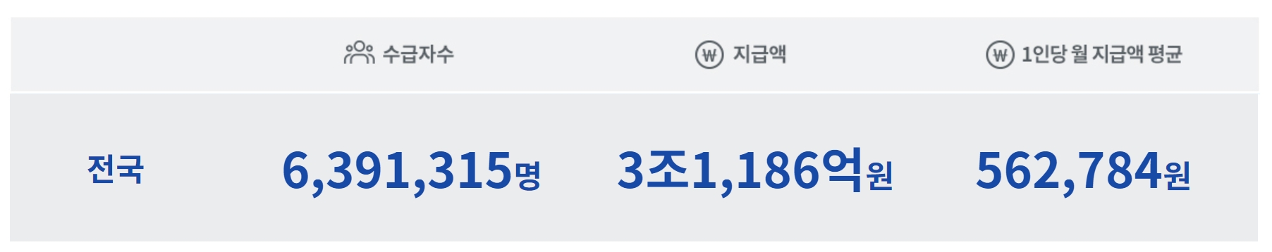 전국 국민연금 급여지급 통계를 확인해 볼 수 있습니다. 국민연금 수급자는 639만명이며, 지급액과 1인당 월 지급액 평균액은 아래 표를 참고하시기 바랍니다.