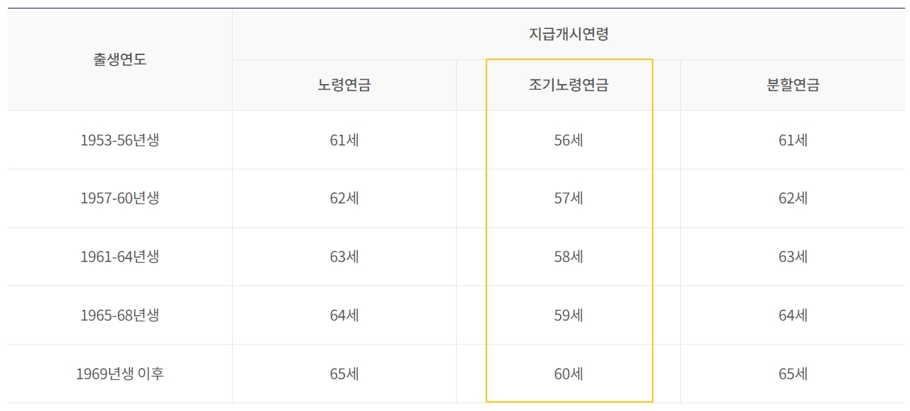 아래 표에 따라 출생연도에 따른 지급개시연령을 확인해 보시기 바랍니다.