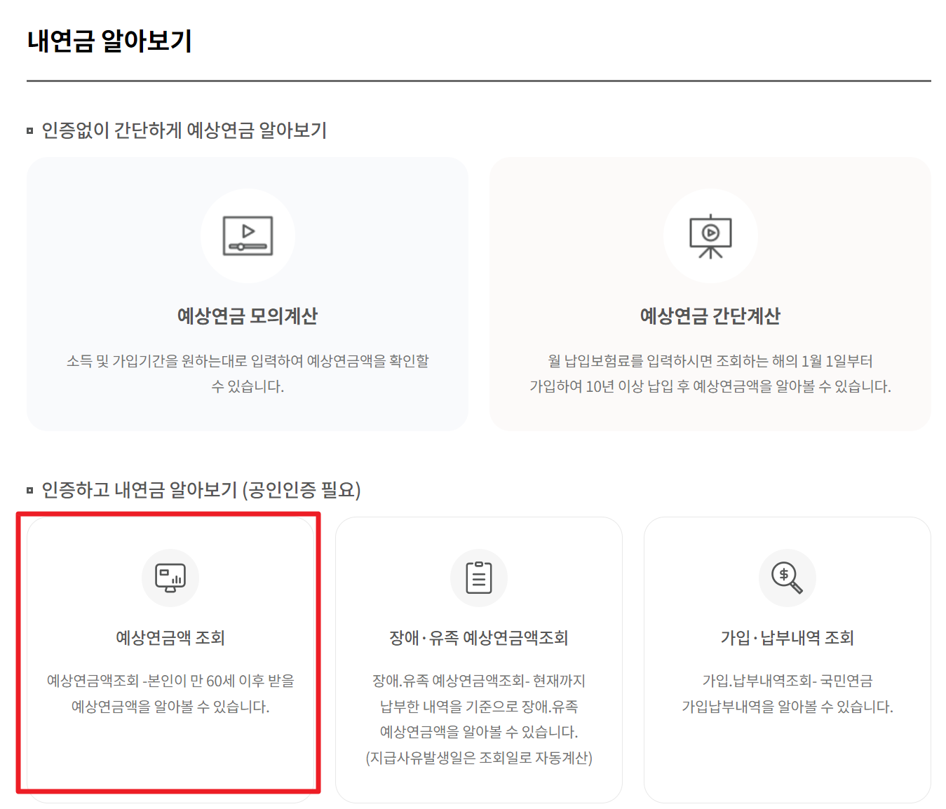 좀 더 정확한 국민연금 수령액을 알아보기 위해서는 본인인증이 필요합니다. 실제로 내가 매월 받게 되는 금액을 확인할 수 있습니다. 아래 빨간색 영역을 클릭하시면 됩니다.
