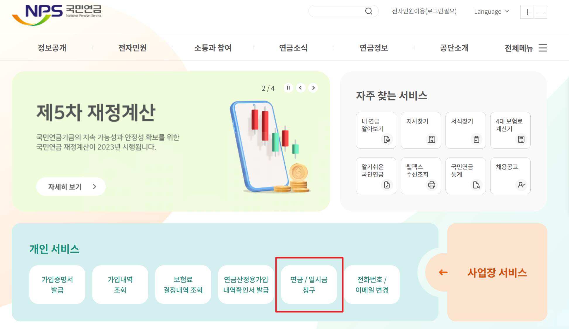 위 버튼을 클릭할 경우 아래 국민연금 홈페이지에서 '연금 / 일시금 청구' 버튼을 클릭 후 로그인 후 신청하실 수 있습니다.