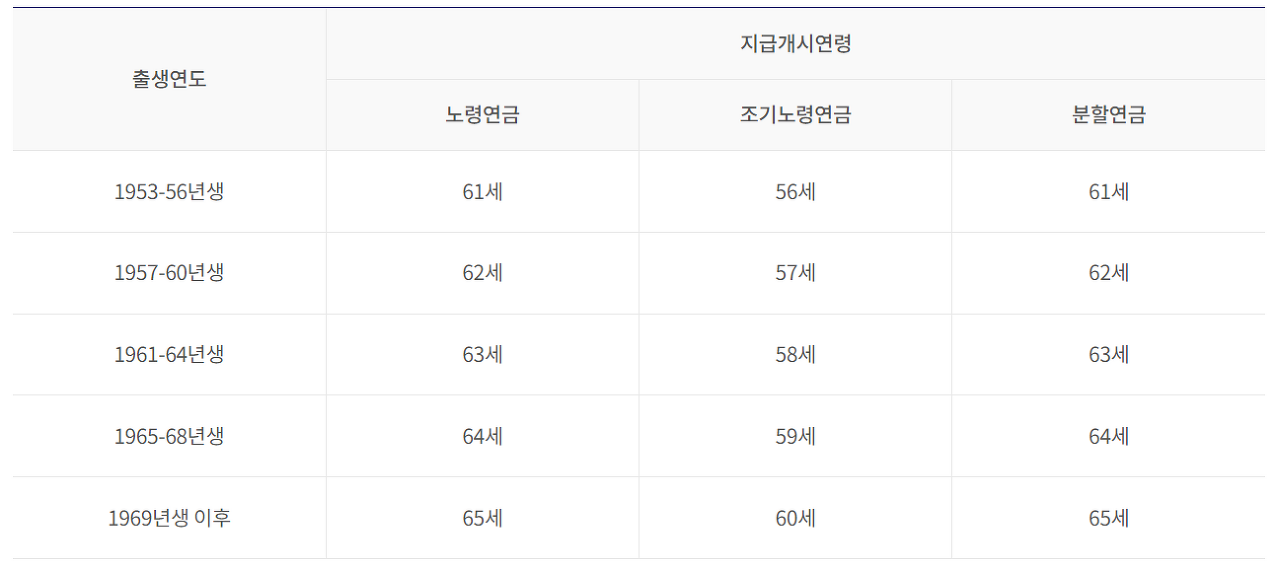그렇다면 이렇게 국민연금을 매월 내게 된다면 수령시기는 언제가 되는 걸까요? 아래 표를 확인해보시기 바랍니다.