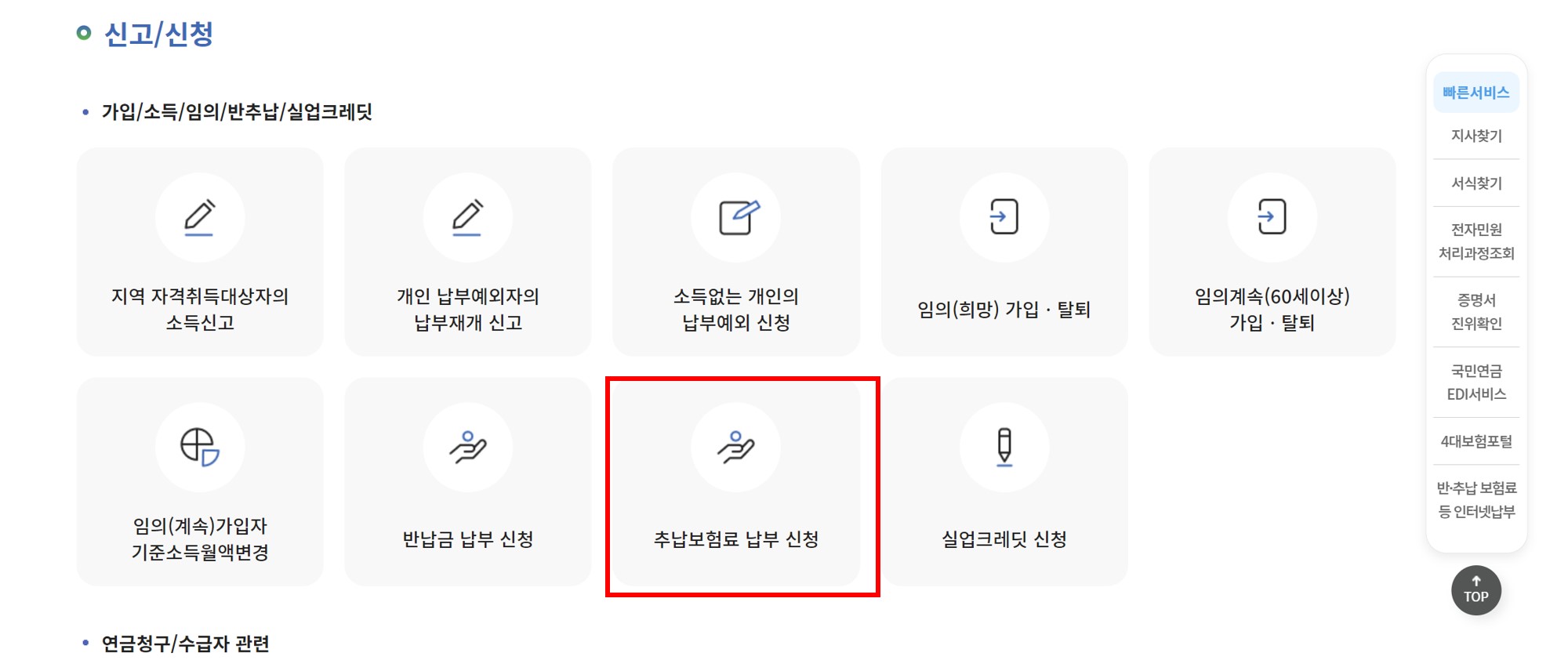 국민연금 추납제도 신청은 국민연금 공단 사이트에서 진행할 수 있습니다. 국민연금 > 전자민원 > 개인민원 > 신고 / 신청으로 들어가시면 공동인증 또는 공인인증 후 이용하실 수 있습니다.