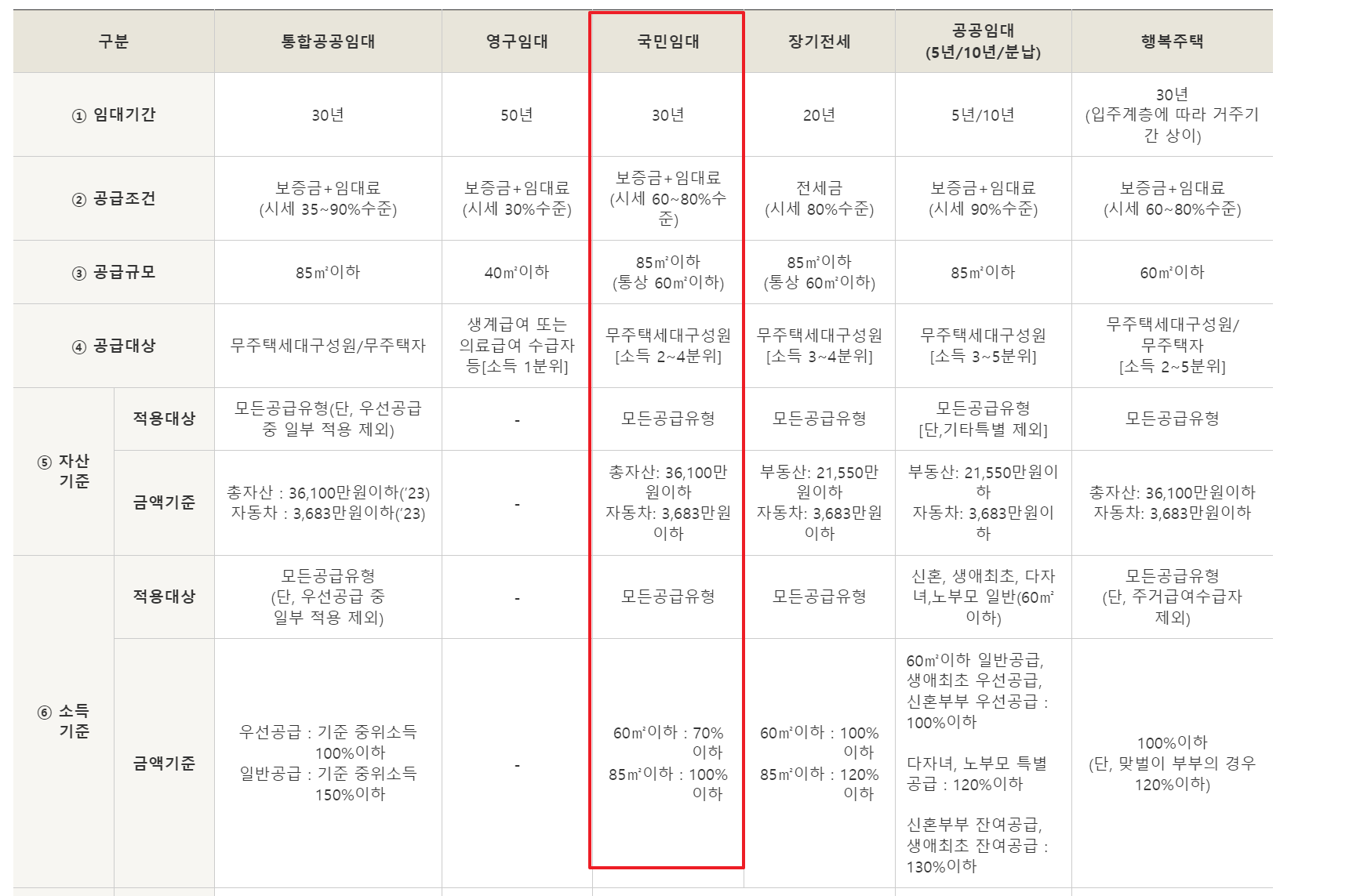 공공의 재정과 국민주택기금의 재원을 지원받아 건설되거나 임대되는 주택입니다. 보통 국민임대주택은 30년 동안 임대기간이 긴 편이고 규모는 85m2 이하의 주택을 지원받을 수 있습니다.