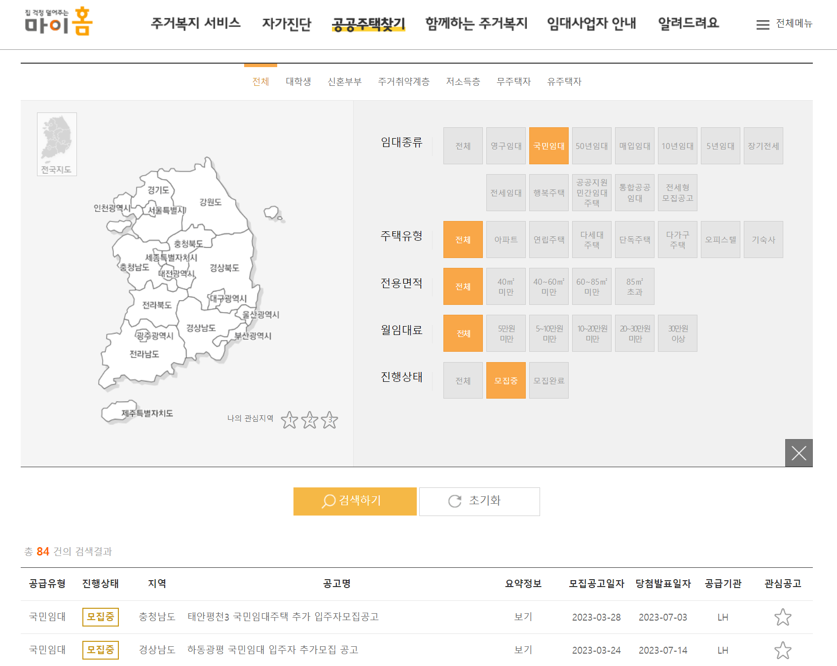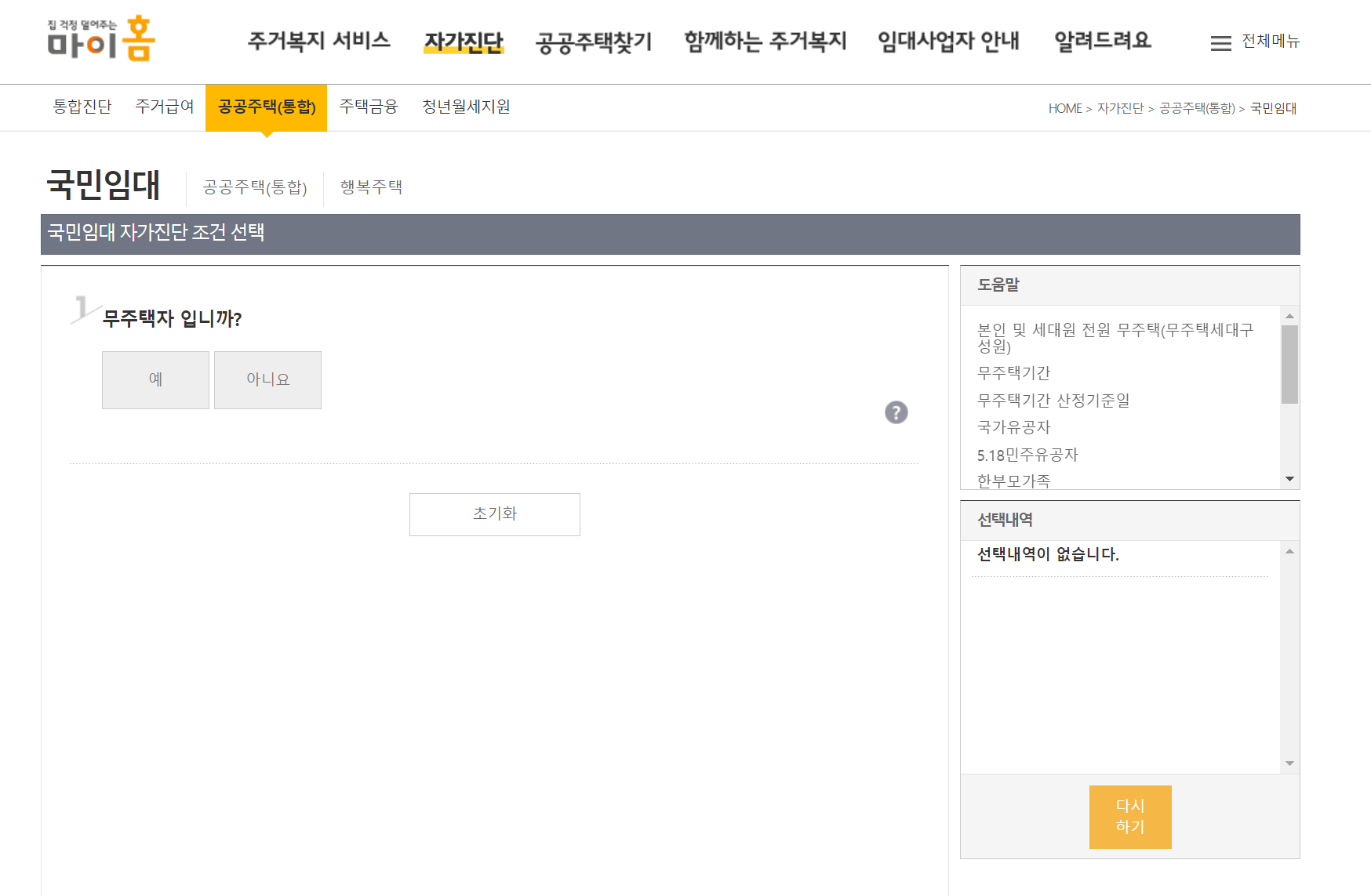 마이홈 포털 사이트에서는 국민임대주택에 입주하고 싶은 사람을 위해 자가진단 서비스를 제공하고 있습니다.