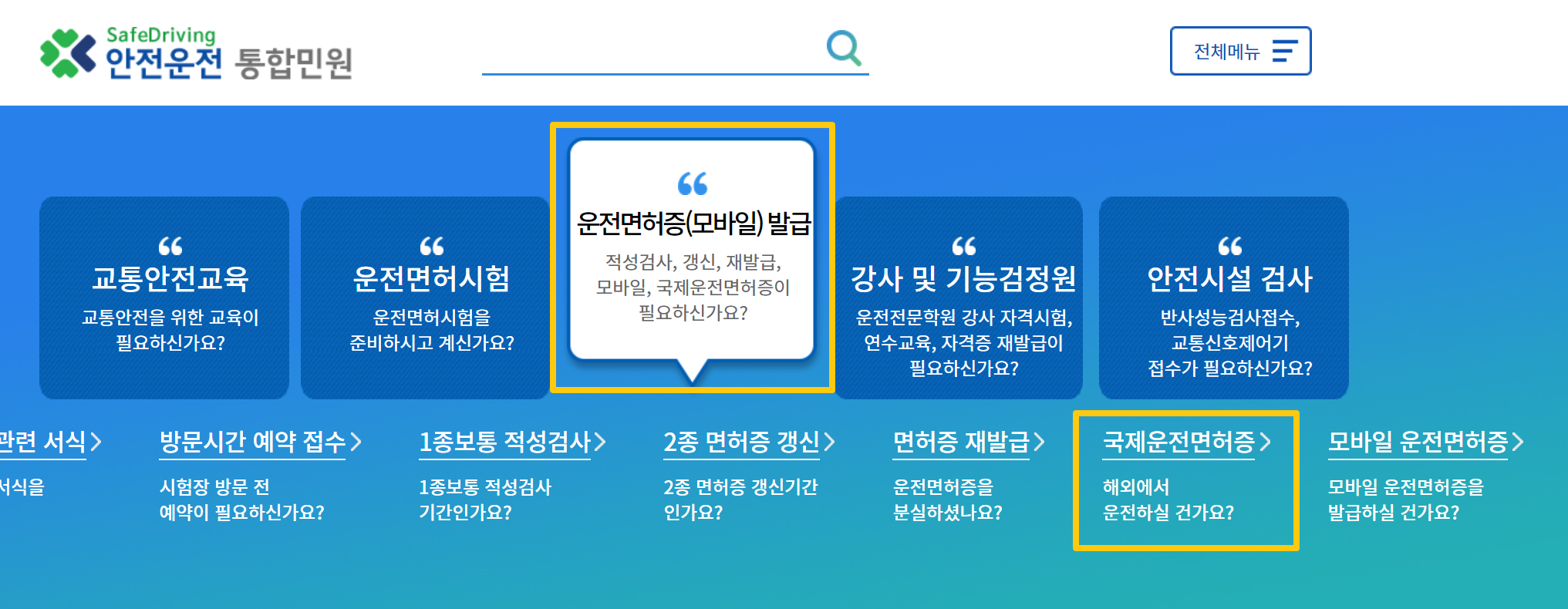 도로교통공단에서는 안전운전 통합민원 홈페이지를 운영하며, 운전면허증발급에 대한 서비스를 진행하고 있는데요, 이 홈페이지에서 국제 운전면허증도 신청이 가능합니다.