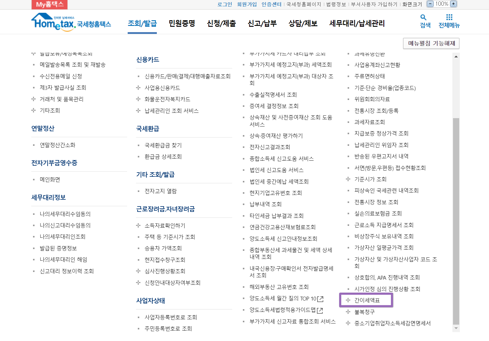버튼 클릭시 홈택스 홈페이지로 이동하며 탭에 조회/발급 클릭 후 간이세액표를 클릭하시면 됩니다. 간이세액표는 작은 카테고리에 있는 근로소득간이세액표를 클릭해줍니다.