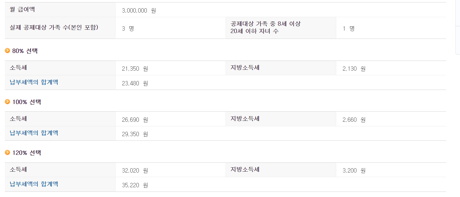 그렇다면, 계산을 진행해볼까요? 내가 받는 월 급여가 300만원일 경우 공제 대상 가족수가 본인 포함하여 3명이고 그 중에 자녀 수가 1명일 경우로 가정해보도록 하겠습니다.