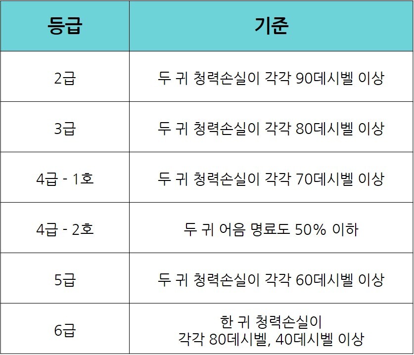 보통 난청으로 인해 청력 손실이 심한 경우 6가지 등급이 매겨집니다. 2급에 가까울수록 손실 정도가 심한 것인데요, 만약 난청으로 힘든 시간을 보내고 계시다면 이비인후과에 가셔서 장애등급에 해당하는지 검사를 받아보시는 것을 권장드립니다.