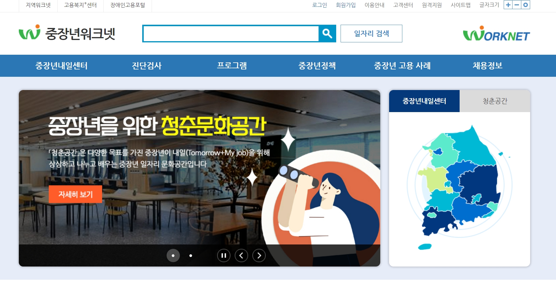 전국적으로 있는 지역센터를 운영하여 만 40세 이상인 중장년을 대상으로 취업지원서비스를 무료로 제공하는 사이트입니다.
