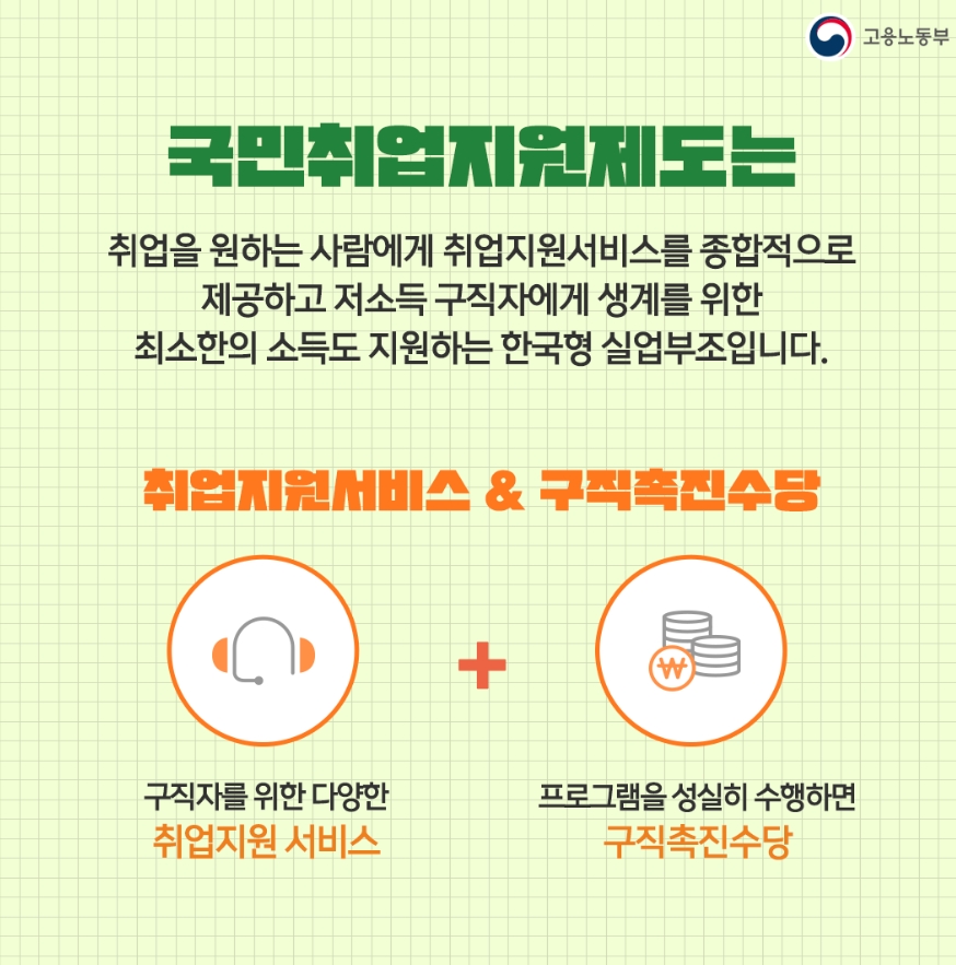 취업을 원하는 사람에게 취업지원 서비스를 제공하는 국민취업지원제도도 있습니다. 저소득층이면서 구직을 원하는 분들이라면 이 제도를 통해 구직촉진수당을 받으며 생계도 도움받을 수 있는 제도입니다.
