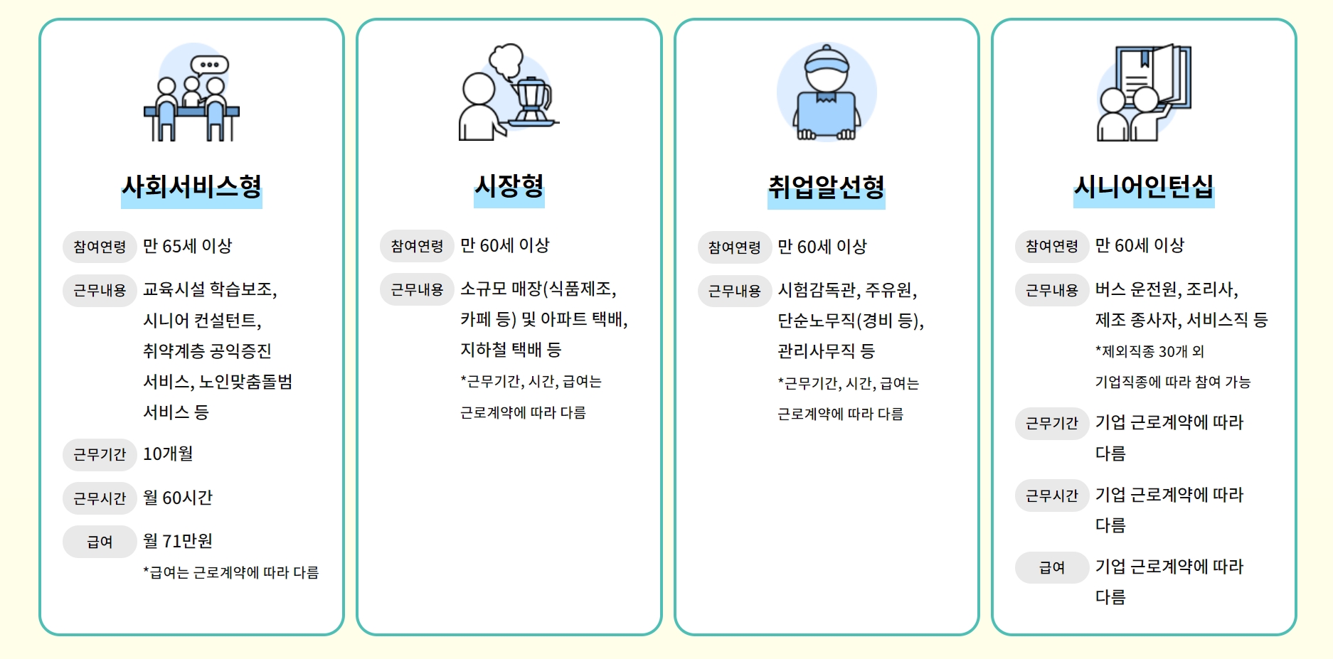 또한 지역사회에 공헌하는 사회활동도 확인할 수 있지만 여러 유형의 일자리를 보고 직접 참여할 수 있도록 신청할 수 있는데요, 사회서비스형이냐, 시장형, 취업알선형, 시니어 인턴십 등 나이에 따라 하고 싶은 일을 선택할 수 있습니다.