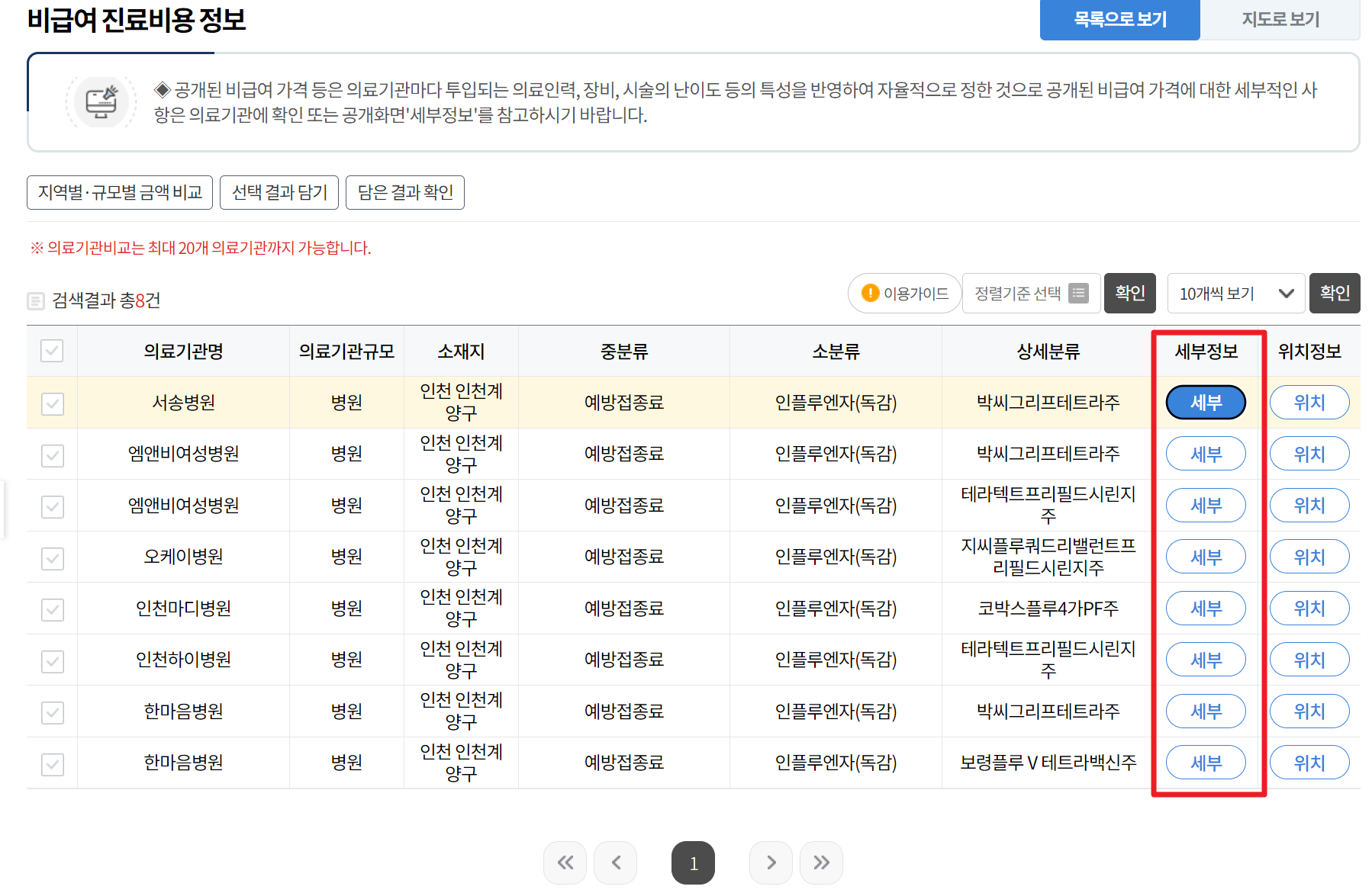 체크한 주사비용으로 의료기관을 검색하면, 아래와 같이 세부정보를 확인할 수 있습니다.