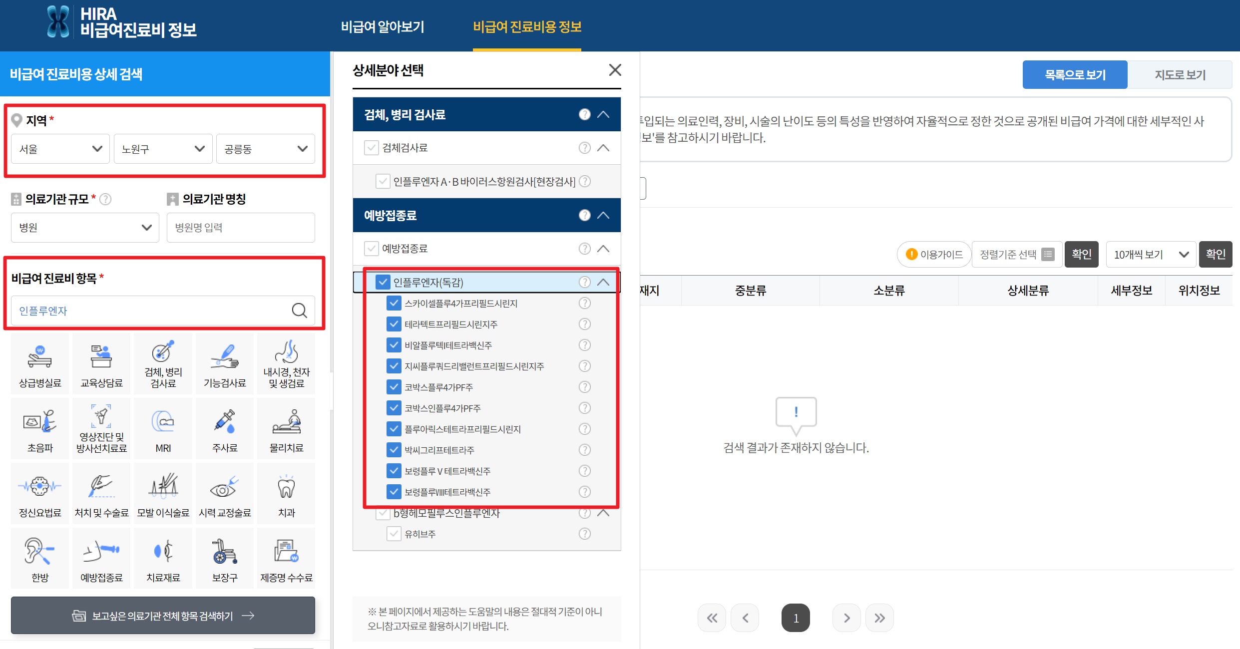 ✅ 비급여 진료비 항목 : 인플루엔자로 검색