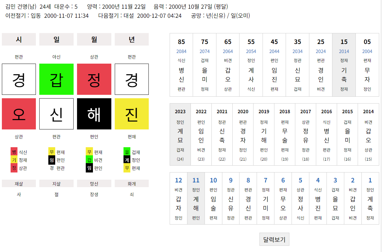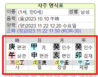 내가 넣은 사주대로 아래 사주명식표에 내 정보가 바로 나타나는 것을 확인할 수 있습니다.