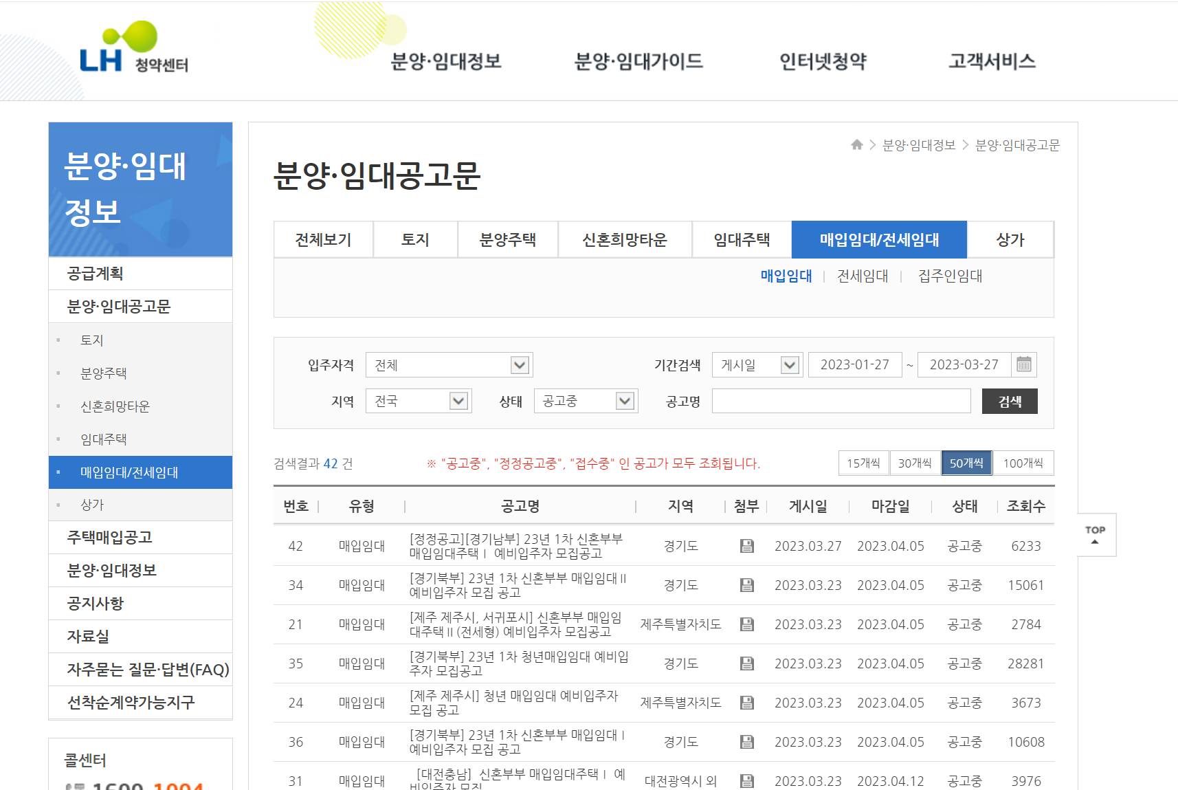 매입 임대주택을 확인하기 위해서는 LH 청약센터에서 진행할 수 있습니다. 하기 버튼을 클릭하시어 전국적으로 진행되고 있는 매입임대주택 모집공고 내용을 확인해 보시기 바랍니다.
