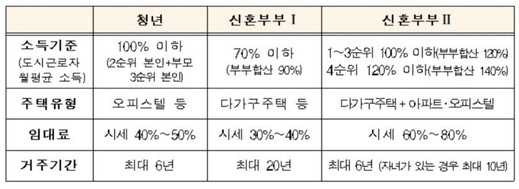 매입 임대주택 종류는 아래와 같습니다. 무주택자인 미혼 청년(19세 ~ 39세)을 대상으로 소득 수준에 따라 입주순위가 결정됩니다.