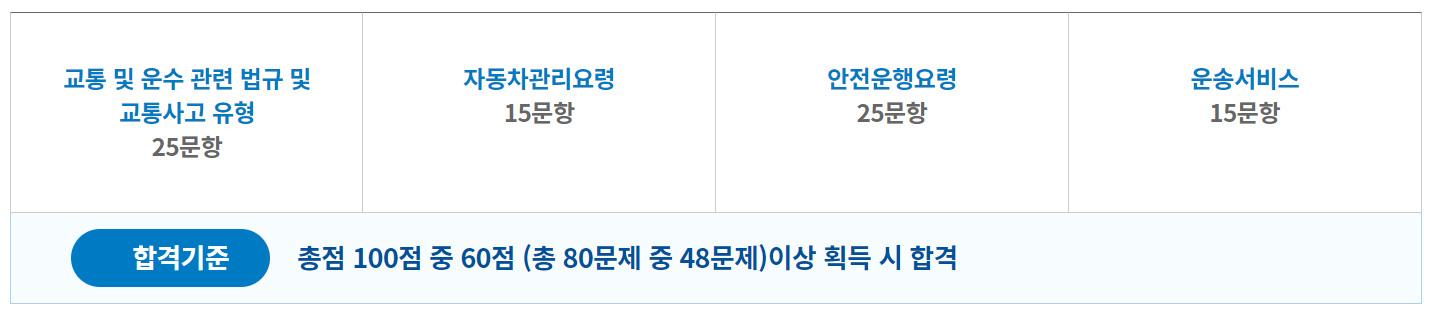 시험 항목은 아래와 같습니다. 총 100점 중 60점을 획득해야만 합격이 됩니다. 버스운전 자격증을 취득하기 위해서는 컴퓨터 시험 CBT용을 통해 시험에 응시하게 되며, 시험 종료 후 바로 시험결과를 확인할 수 있습니다.
