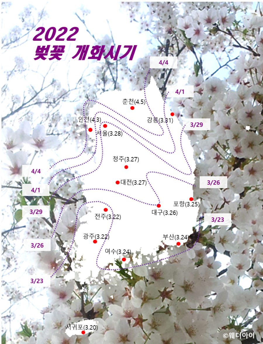 아래는 벚꽃개화시기 2022년 예측 정보입니다.