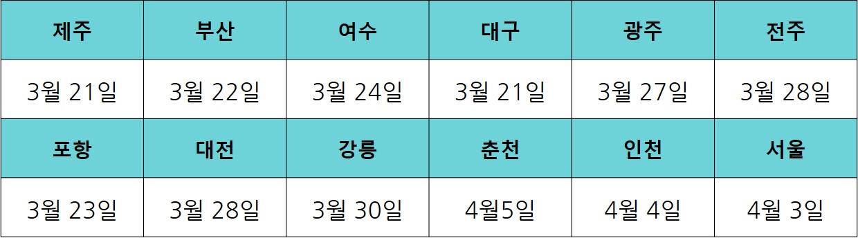 2022년과 2023년 개화시기는 지역별로 하루에서 5일가량 차이가 날 수 있으나 보통 전국적으로 4월 첫째 주 가량이면 벚꽃나무가 만발한 모습을 볼 수 있을 것 같습니다. 표로 확인해 볼까요?
