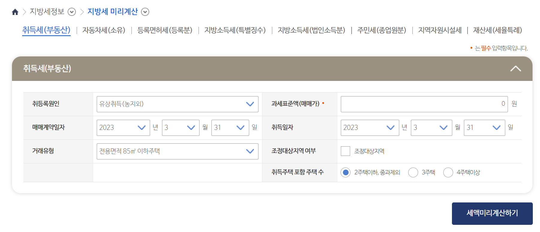 취득세를 계산하기 위해서는 복잡할 수 있기 때문에 위택스에서 제공하는 계산기를 제공하고 있습니다.