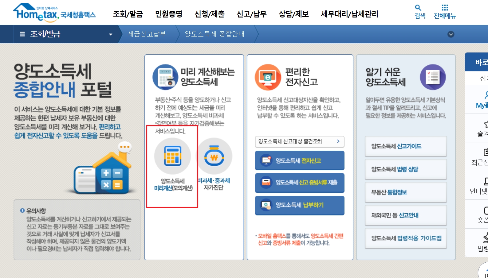 국세청 홈택스 > 세금 종류별 서비스 > 양도소득세 > 양도소득세 미리계산
