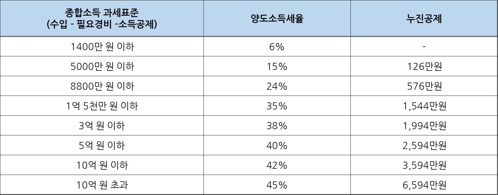 양도소득세를 구할 경우 과세표준을 구해야 하는데요, 이에 따라 세율이 각각 적용됩니다. 1,400만 원에서 10억 원을 초과하는 과세표준에 따라 최대 45%까지 세율이 적용되기 때문입니다.