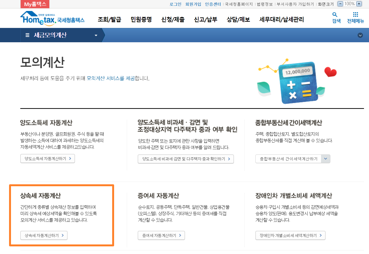 바로 이동하는 루트가 없기 때문에 이동한 페이지에서 홈택스 [세금 모의계산] ▶ [상속세 자동계산] 으로 이동합니다.