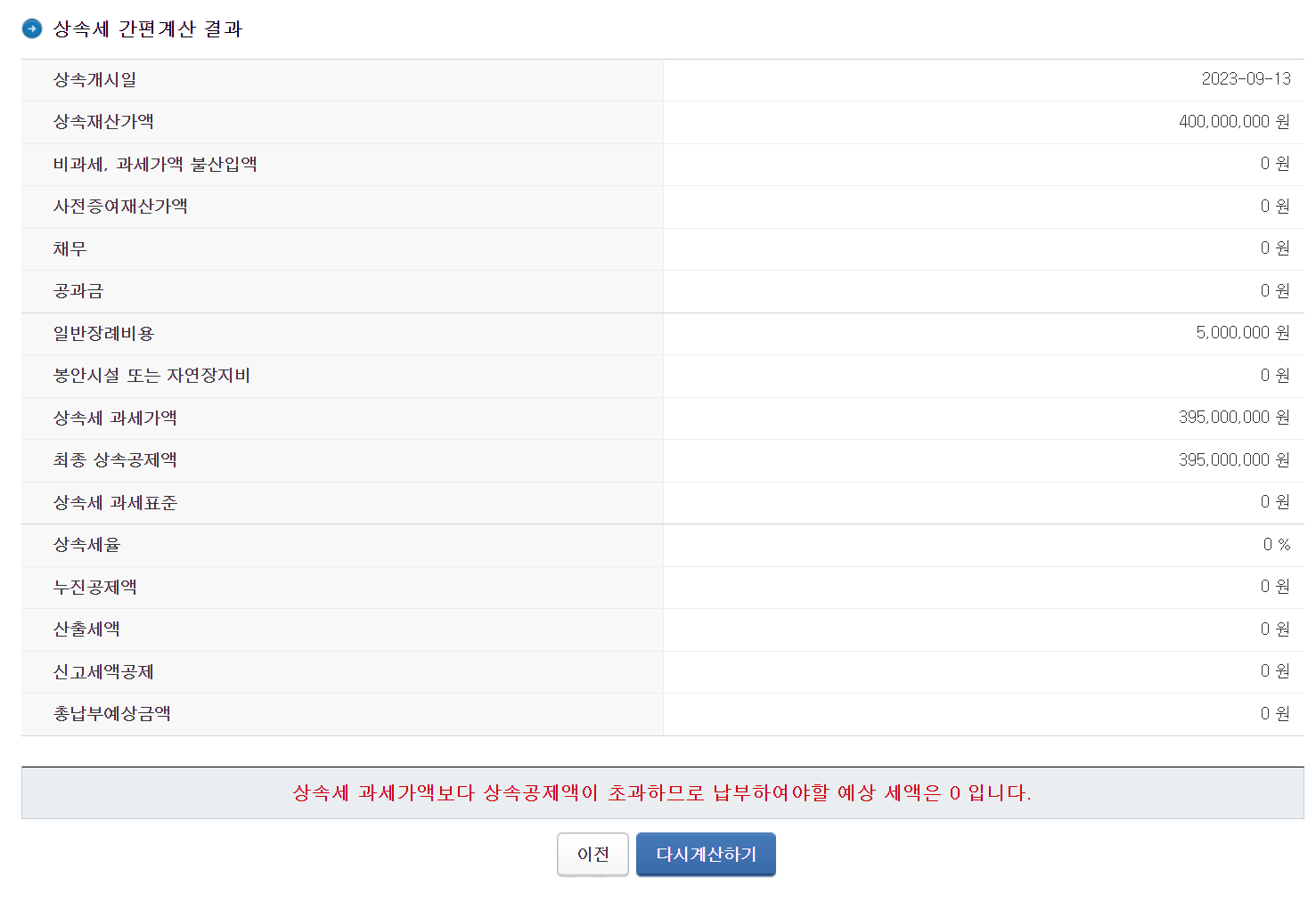 재산 가액에서 장례비용을 제외 후 상속세를 계산해보았습니다. 예상 세액은 0원으로 산정되 는 것을 확인할 수 있습니다.