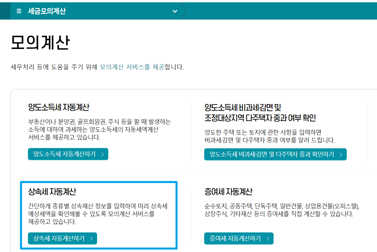 위 버튼 클릭 후 아래와같이 상속세 계산기를 클릭해줍니다.