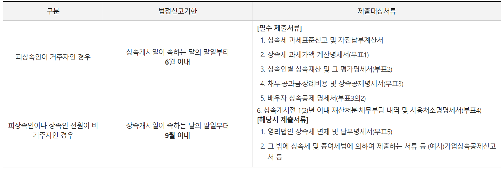 상속인이 사망한 일자를 상속 개시일이라고 하는데요, 거주자일 경우와 거주자가 아닐 경우에 법정 신고기한이 나뉘어집니다. 무신고할 경우 20% 가산세가 청구될 수도 있으니 되도록 기한 내에 신고 및 납부하는 것을 권장 드립니다.