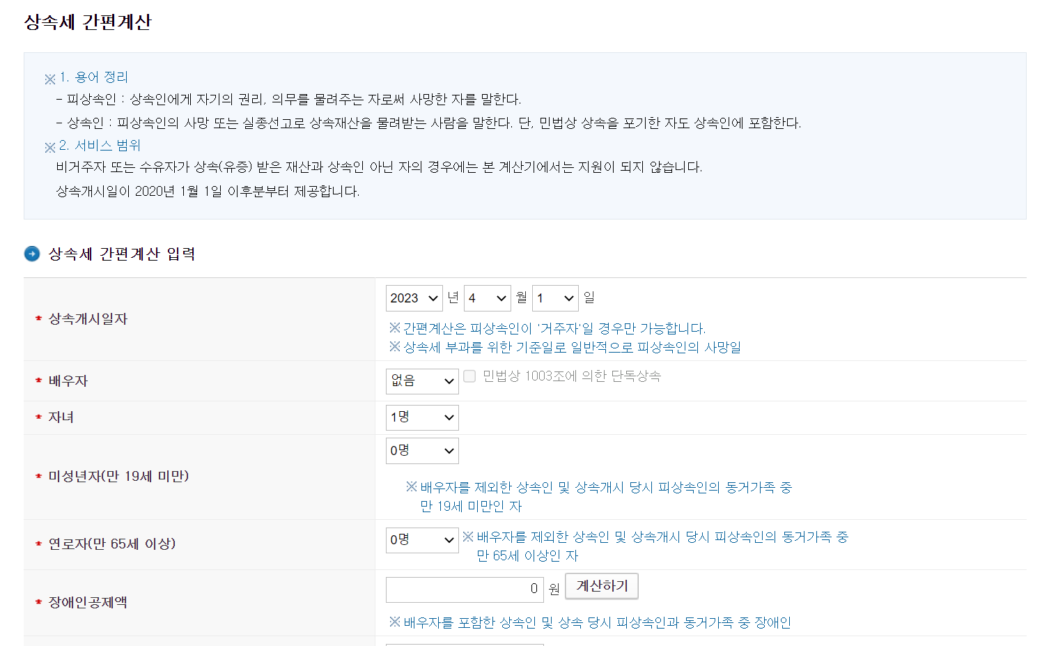 버튼을 누르신다면 로그인 없이도 상속세를 간편하게 계산하실 수 있도록 계산기가 준비되어있는데요, 빨간색 별표로 표시되어있는 영역을 채우실 경우 상속세를 간편하게 계산하실 수 있습니다.