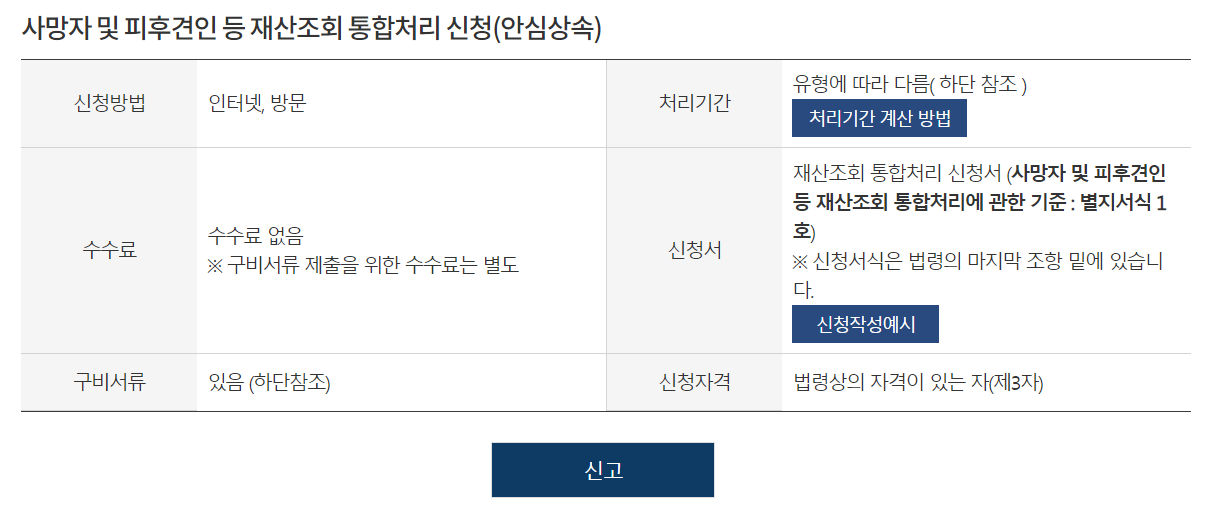 신청 시 구비 서류가 있는데요, 재산 조회 통합처리 신청서, 피상속자의 신분증, 가족관계증명서, 상속 관계 증빙 서류 등입니다.