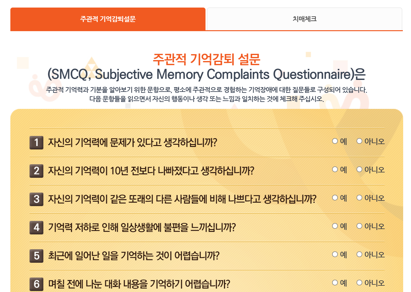 알츠하이머 자가진단 버튼을 클릭하시면 아래와 같은 설문지가 있는 페이지로 이동됩니다. 내가 알츠하이머 증상이 조금이라도 있다면, 아래 자가진단을 통해 확인해보실 수 있습니다.