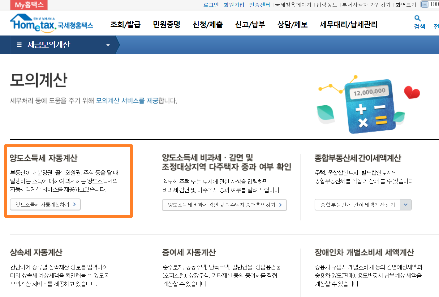 양도소득세는 국세청 홈택스 홈페이지에서 계산기로 계산이 가능합니다. 아래 버튼대로 이동시 양도소득세 자동계산기를 확인해볼 수 있습니다.