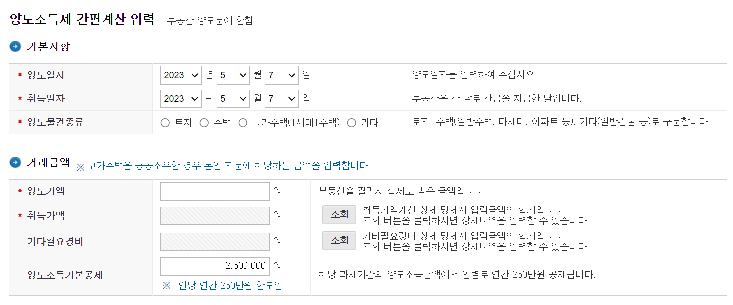 아래 버튼을 통해 양도소득세 자동계산을 할 수 있는 페이지로 바로 이동해보시기 바랍니다.