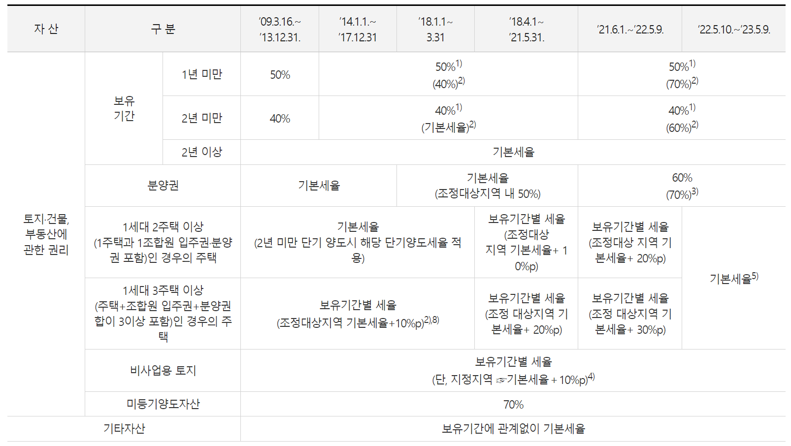 보통 양도소득세는 보유기간에 따라 세율이 달라질 수 있습니다. 1년 미만의 경우 50%가량 양도소득세가 부과되며 2년 이상 갖고 있을 경우 기본세율로 적용됩니다.