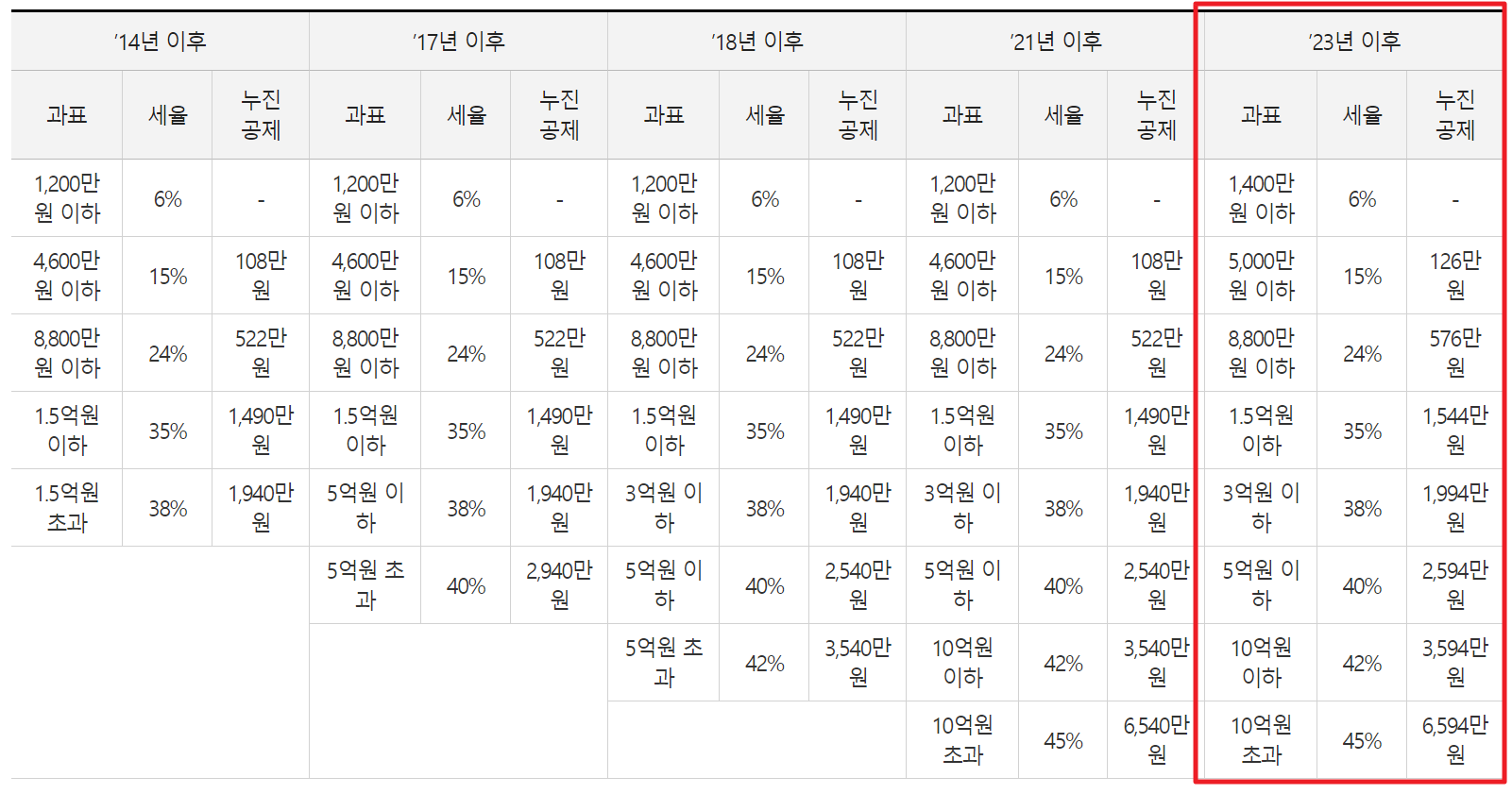 먼저 아래는 양도소득세의 기본세율입니다. 해당 세율은 최근 개정되어 2024년부터 빨간색 색인되어 있는 세율로 적용될 예정입니다.