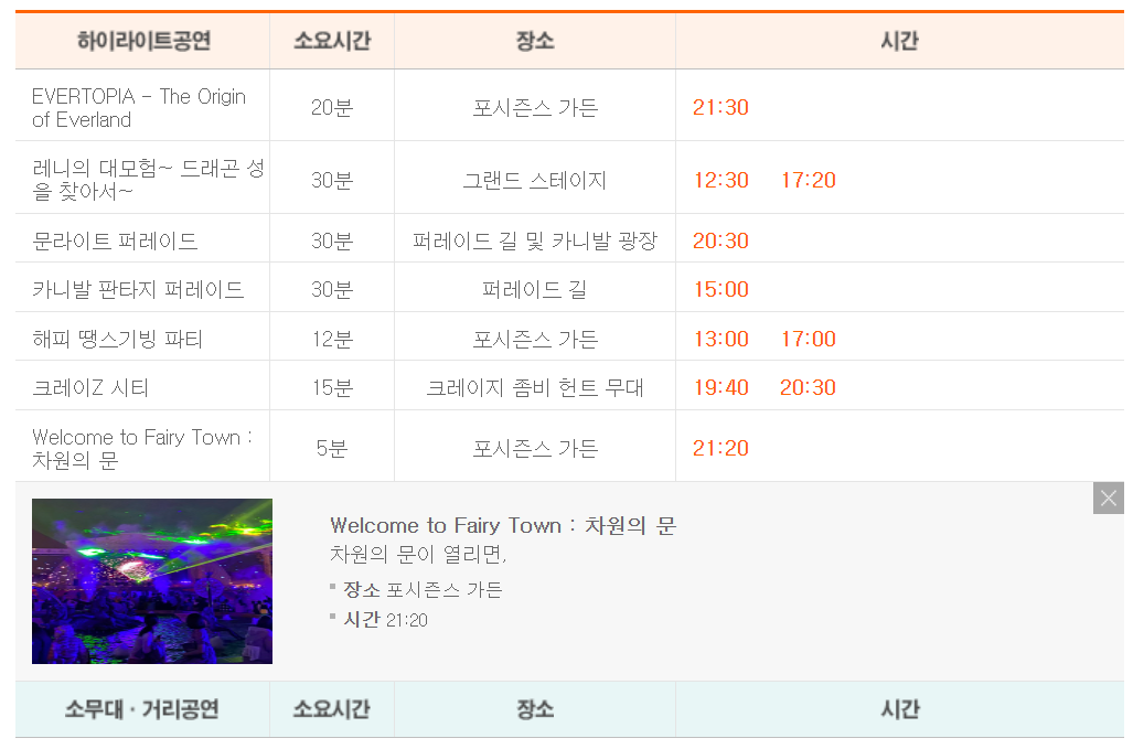 좀 더 정확하게 말씀드리면, 에버랜드 홈페이지에서 매일 이용시간과 함께 그 날의 하이라이트 공연에 대해서 스케쥴링 되어있는 것을 확인하시면 되는데요,