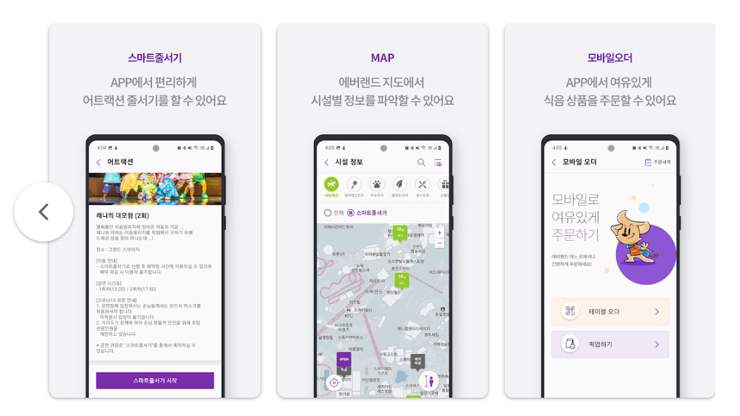 스마트 줄서기 등 여러가지 편하게 시설을 이용하기 위해서는 미리 예약하는 등 여러가지 편의를 위한 앱이며 매우 넓기 때문에 지도도 확인해볼 수 있습니다.