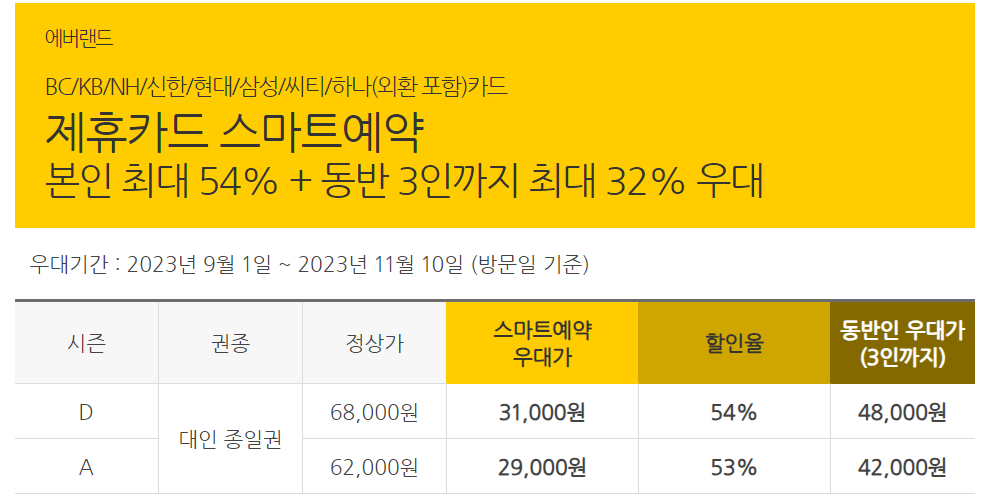 방문일 기준 1일 1회 카 드자 본인명의로 한해 결제되었을 때 에버랜드 할인이 최대 54%이며, 동반 3인까지 32% 할인이 가능합니다.