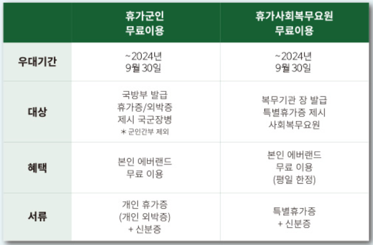 이 외에도 생일자 우대 혜택이라던지, 오후권 15시 이상 입장시 할인 혜택, 교복 대여시, 할인 혜택 등이 있습니다. 하지만 여기서 무료로 에버랜드를 이용할 수 있는 분들이 있는데요 바로 국군장병 분들입니다.
