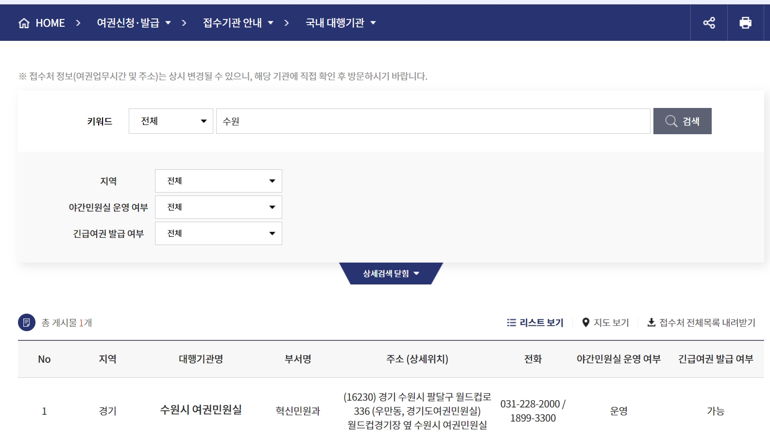 수원으로 지역을 검색했을 때 대행기관명이 수원시 여권민원실로 나오고 주소와, 연락처, 그리고 야간민원실과 긴급여권이 운영 하는 것을 체크해볼 수 있습니다.