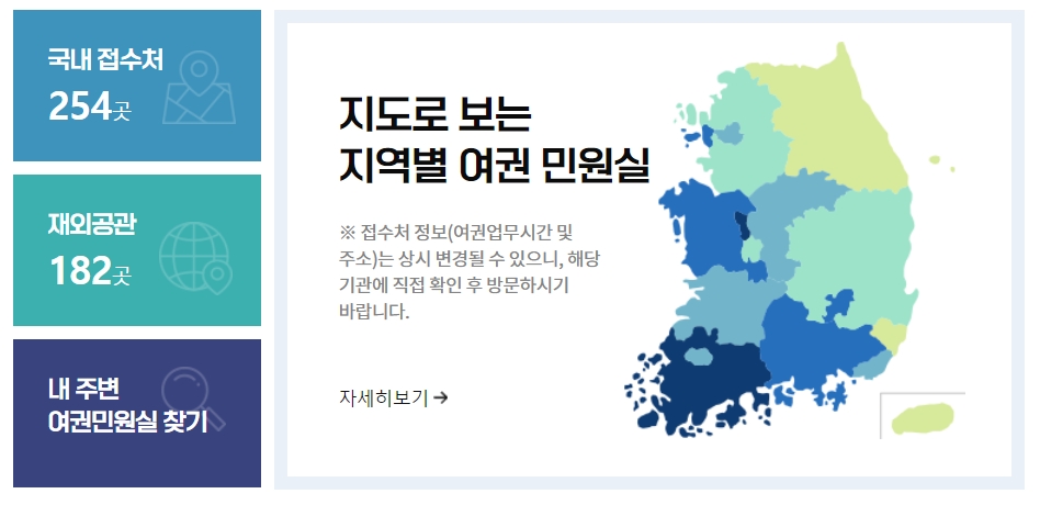 국내에는 여권 민원실이 254곳에서 여권 신청을 받고 있습니다. 위 버튼을 클릭하시면 내 근처에 있는 여권 민원실을 검색해볼 수 있습니다.