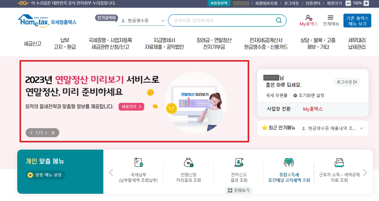 국세청 홈택스 홈페이지 메인으로 이동시 바로 2023년 연말정산 미리보기 서비스로 연말정산을 준비하라는안내 문구가 있는 배너를 클릭하시면 바로 이동할 수 있습니다.