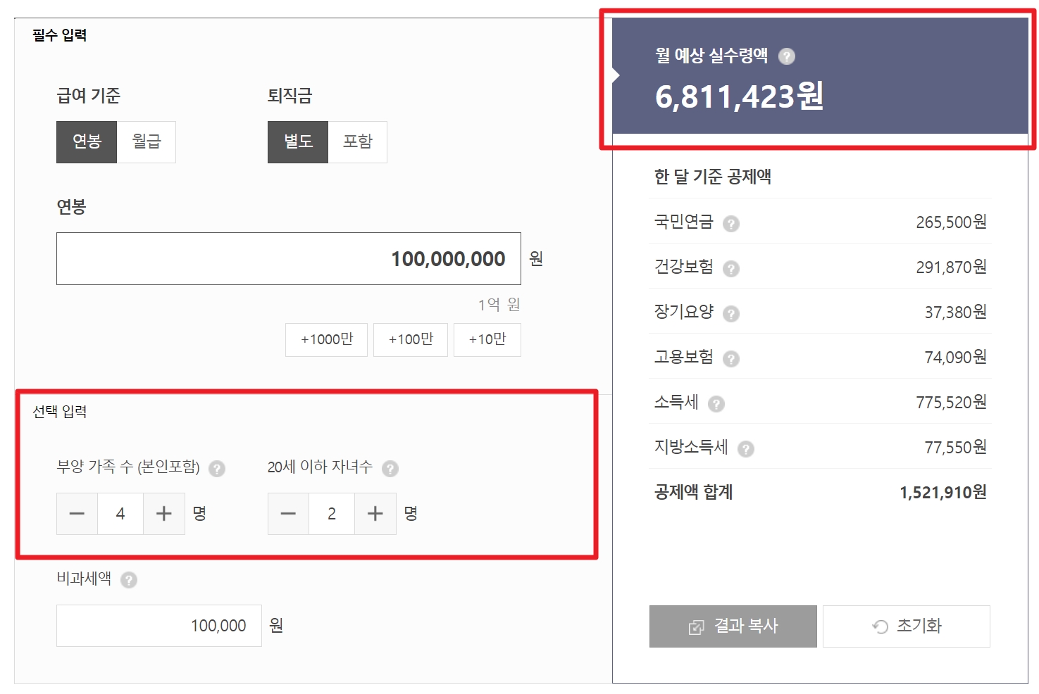 연봉 1억일 경우 부양가족이 있을 경우 월 예상 실수령액은?