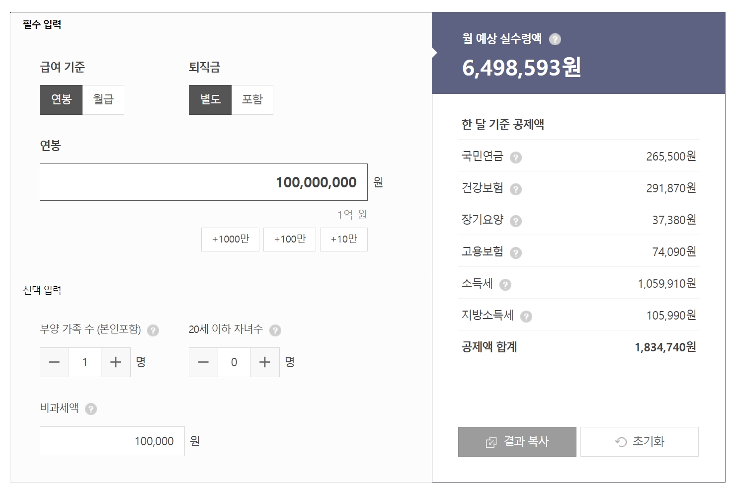 급여기준을 연봉으로 해놓고 연봉 란에 1억원을 기입해보았습니다. 오른쪽에 월 예상 실수령액이 계산되었는데요, 국민연금이 26만원 가량(4대보 험일 경우 5% 가량 나옵니다), 그리고 여러가지 세금 등이 빠지기 때문에 총 공제액 합계는 180정도가 됩니다.