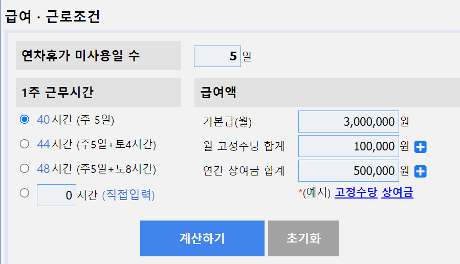 다소 어려울 수 있는 분들께 간단하고 쉬운 연차수당 계산방법을 알려드리도록 하겠습니다. 바로 연차수당 자동계산이 가능한 사이트인데요, 해당 사이트를 활용할 경우 아주 간단하게 연차수당을 계산해 볼 수 있습니다.